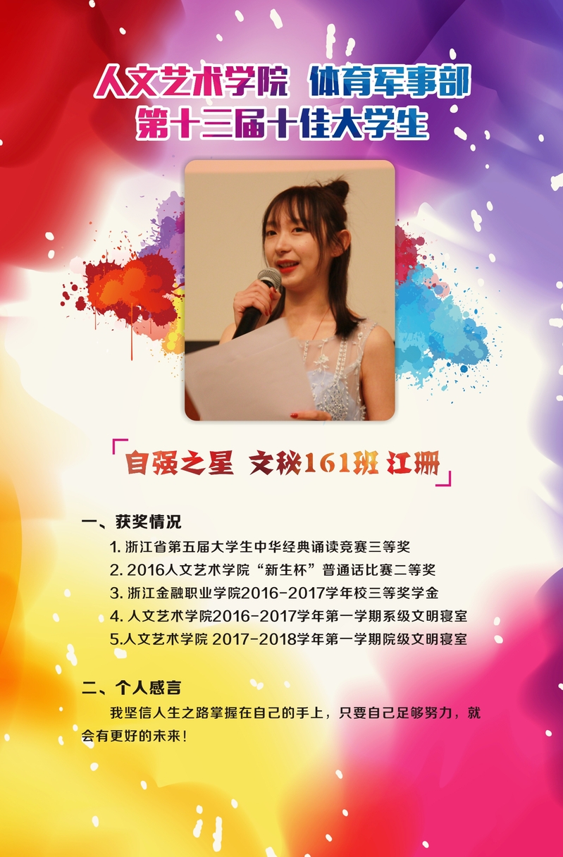 江珊,女,来自文秘161班,曾任7790cnm必发集团员工会主席一职。该生在校期间各方面表现优异,曾获浙江省第五届老员工中华经典诵读竞赛三等奖、校第十三届“十佳老员工”自强之星、2016院“新生杯”普通话比赛二等奖、2016-2017学年校三等奖学金等多个荣誉。