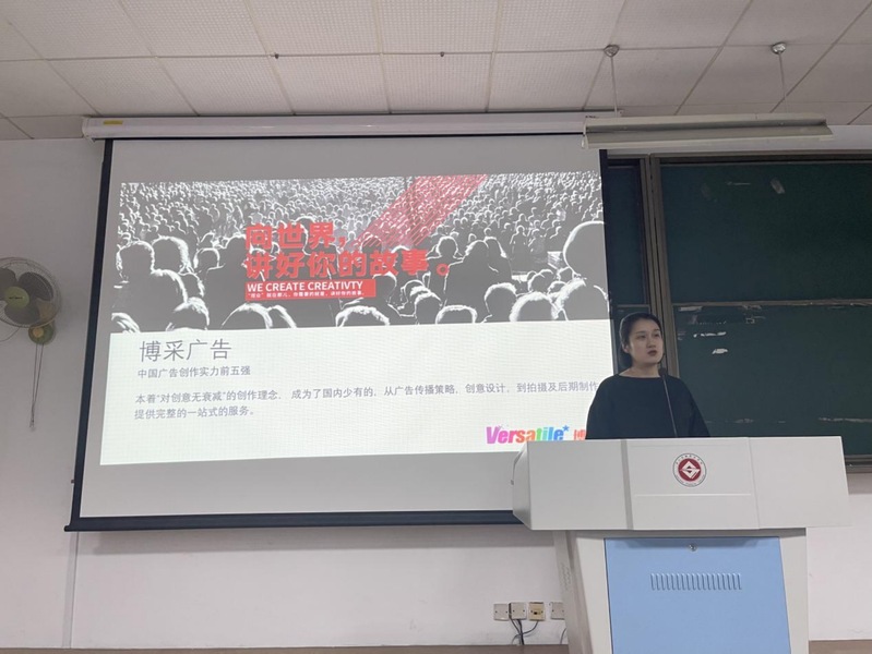 讲座第二阶段,人事经理李瑛由博彩传媒公司的早期广告打开了同学们对博彩传媒公司的初印象。伴随着她对博彩传媒公司广告制作及广告制作组成人员精简明了,由浅入深的讲解,同学们一同观看了博彩传媒近些年的广告作品,其中不乏有家喻户晓的品牌广告,也有定位高端的产品广告,更有高清画面电影质感的虚拟制片。