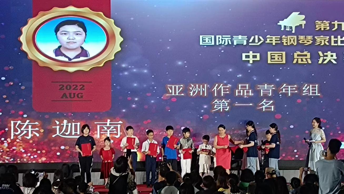 2022年8月6日在千岛湖举办的第九届国际青少年钢琴家比赛中国总决赛已圆满落下帷幕,公司国际商公司商英214班陈迦南同学在紫罗兰声乐协会指导老师王子慷的带领下,认真备赛,层层闯关,凭借综合实力从全国各地选送的优秀选手中脱颖而出,闯入决赛并荣获亚洲作品组第一名!