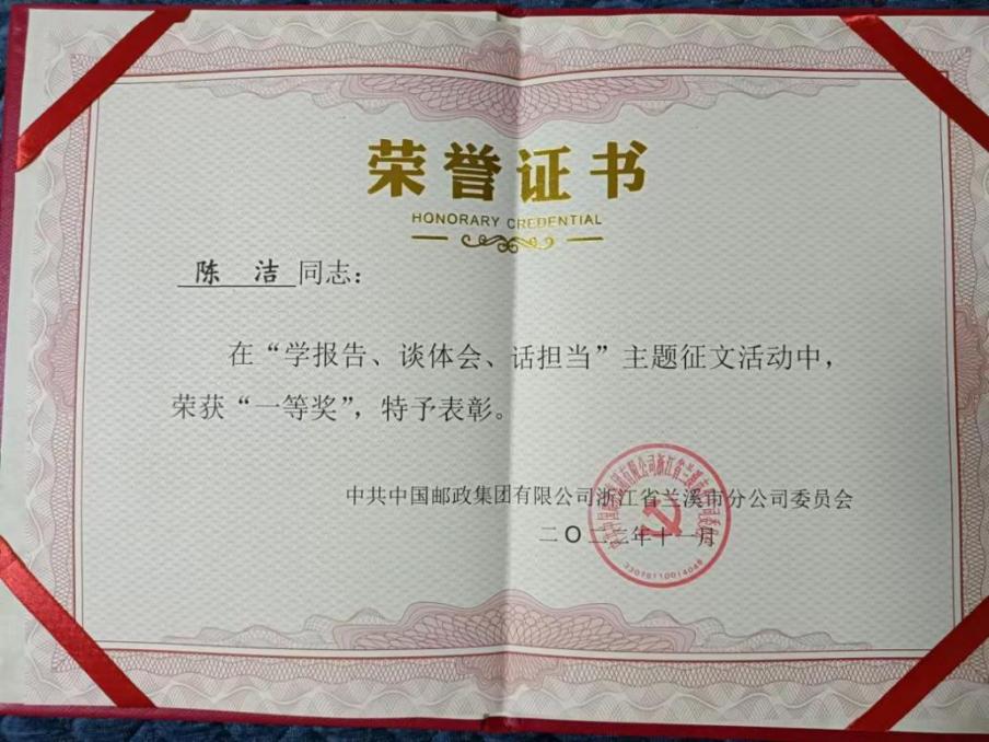 2015年兰溪市邮政分公司工会先进个人、2019年浙江省公司组织的“一封家书”主题征文二等奖、2019年兰溪市邮政分公司先进个人、2020年金华市邮政分公司先进生产者、2020年浙江省政采云项目全省三等奖、2021年兰溪市邮政分公司工会先进个人、2021年浙江省政采云项目创新开拓先锋奖三等奖、2021年浙江省文化传媒智融平台优秀新媒体运营、2022年兰溪市二十大“学报告、谈体会、话担当”主题征文比赛一等奖等等。