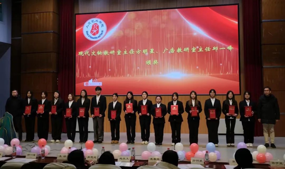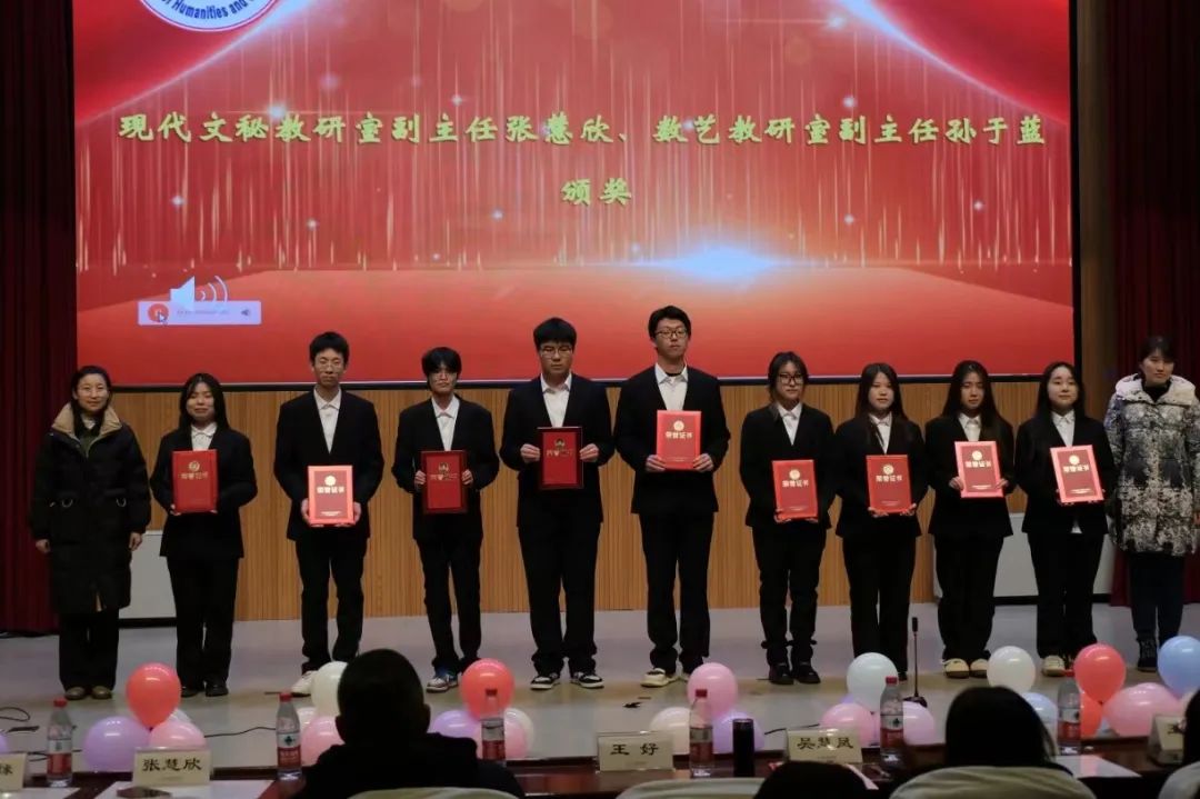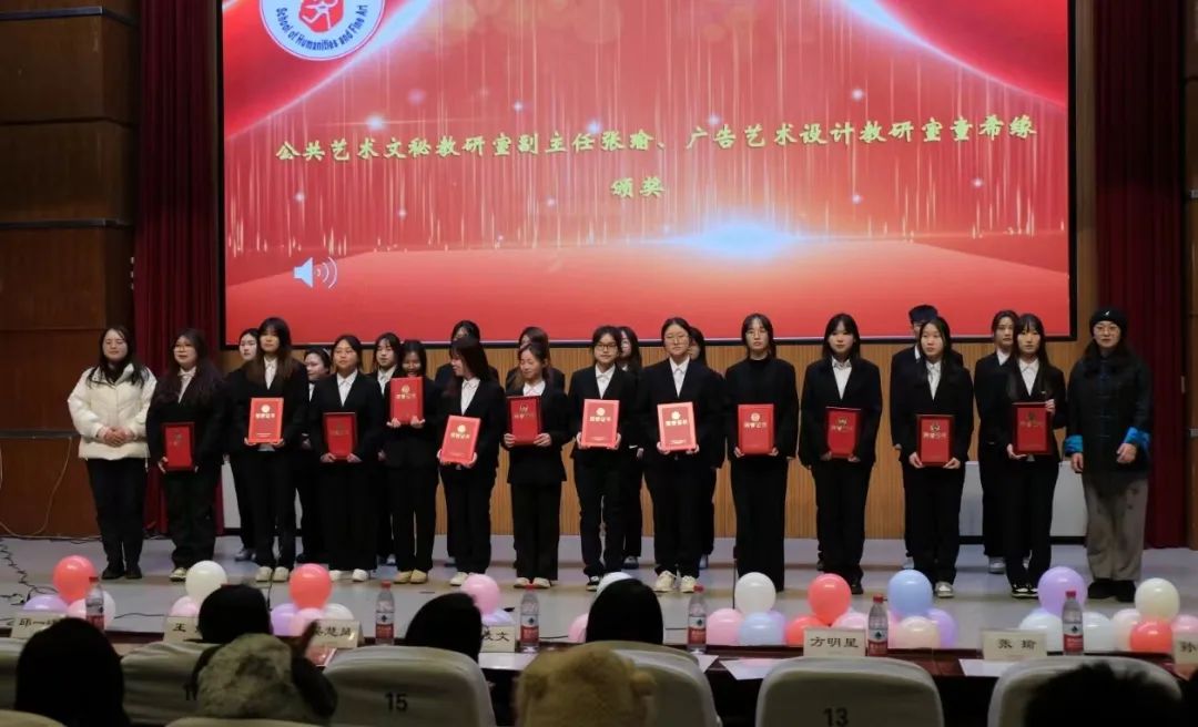 现代文秘教研室副主任张慧欣、数字媒体艺术设计教研室副主任孙于蓝给获奖员工颁奖。