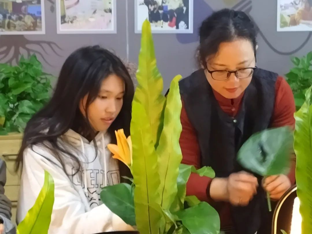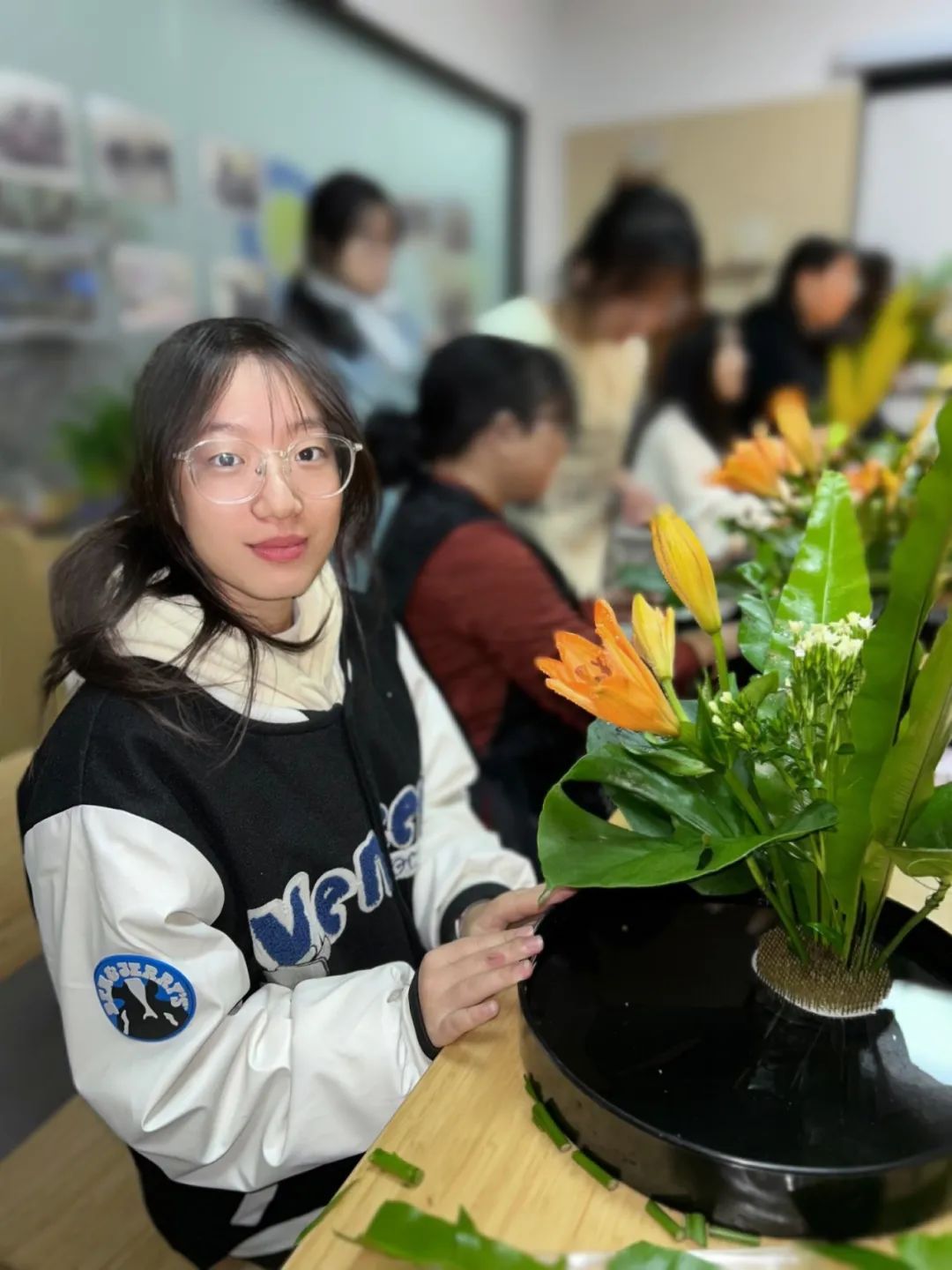 在金祝君老师的耐心解答和一对一指导下,同学们最终将作品完美呈现了出来。通过此次活动,同学们明白了插花是中国人自古生活艺术注重意趣细致的一种方式,常把花草赋予人之感情,由敬爱自然而然化同自然,继而在插花创作上呈现出来。