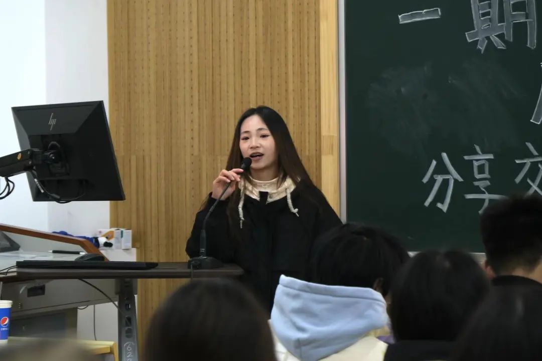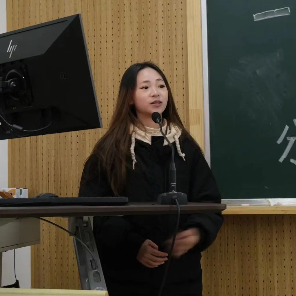 卿茂瑶同学进行了简单的自我介绍,并分享了她的在校经历,她参加过许多形形色色的比赛,例如演讲比赛、征文比赛、“青创杯”比赛。她在比赛中不断磨砺自己,努力提升自己的实力与技能。
